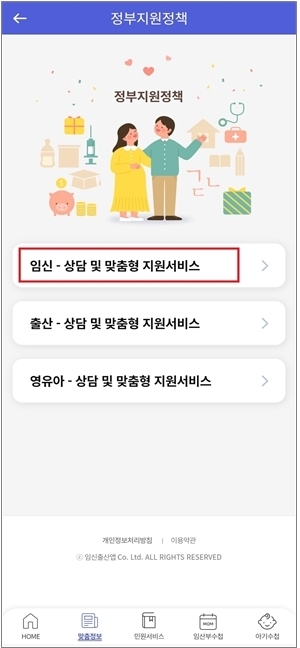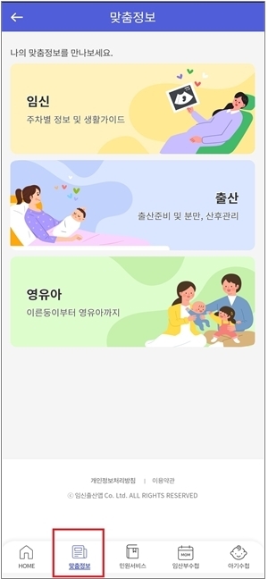 또한, 출산 및 영유아 맞춤정보는 출산 준비사항, 산후관리, 신생아, 월령별 발달정보, 모유수유 방법과 이유식 등을 알려주고 있다.
