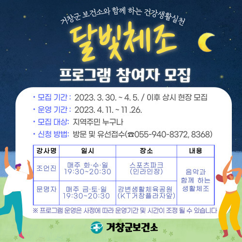 [경남도민뉴스] 거창군은 오는 30일부터 4월 5일까지 1주간 신체활동사업 ‘달빛체조 프로그램’ 참여자를 모집한다.
