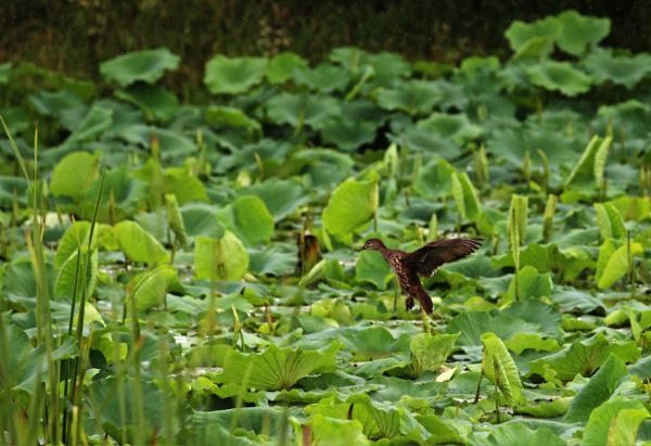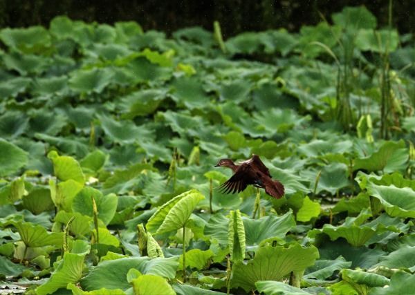 다시 장맛비가 내리기 시작한 29일 산청군 신등면 장승배기생태공원을 찾은 오리 한마리가 힘찬 날갯짓을 하고 있다.
