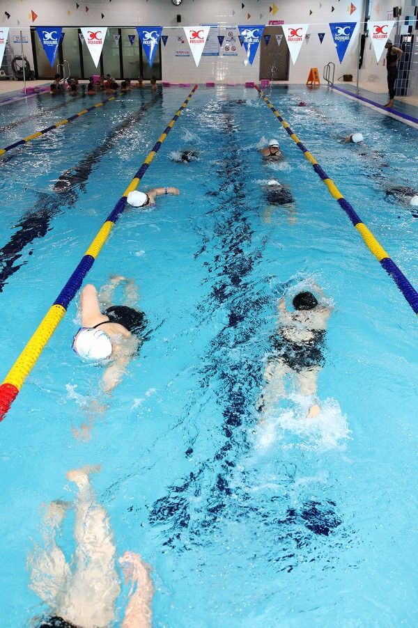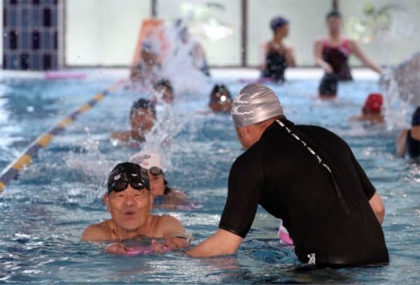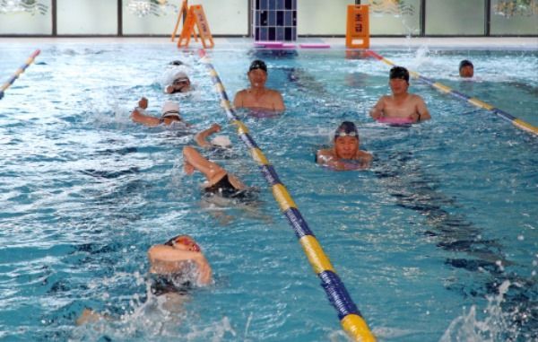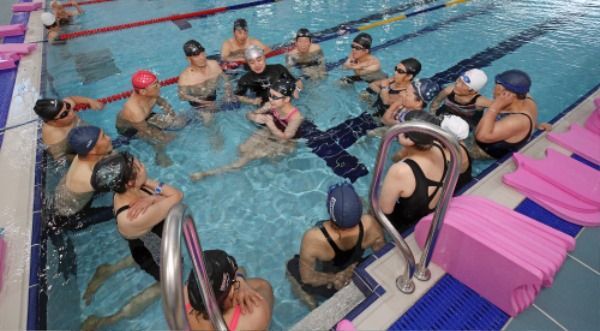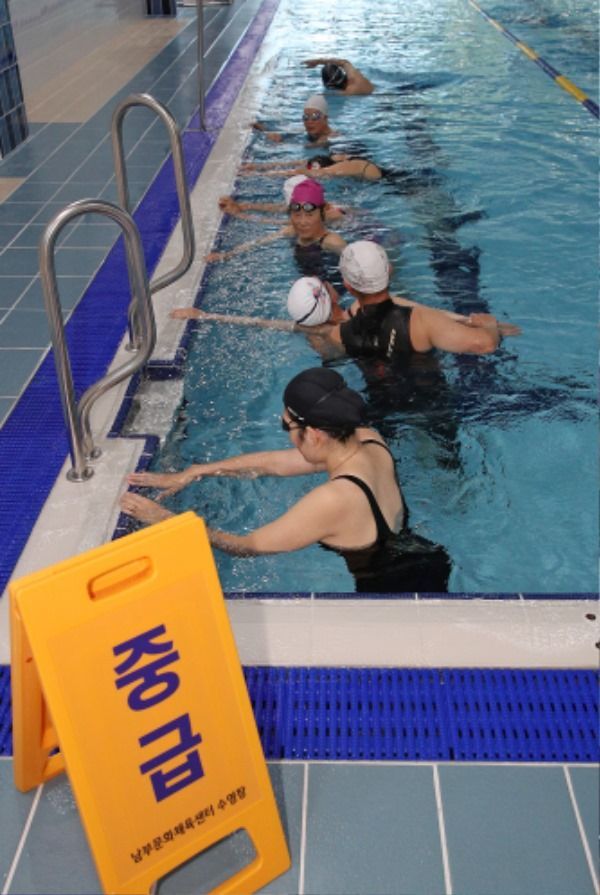 1일 정식 개장한 산청군 신안면 남부문화체육센터 실내수영장을 찾은 주민들이 수영 강습을 받고 있다.