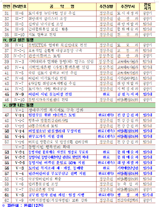 추진상황에 대해서는 분기별·반기별로 점검 평가를 실시하고 통영시 홈페이지에 게시하여 시민들이 모두 알 수 있도록 공개하고 있다. 또한 공약이행상황 점검 보고회를 별도로 개최하여 해당 부서장, 팀장과 직원이 소통하고 공유하는 등 효율적인 추진과 개선 방안 마련에도 만전을 기하고 있다.