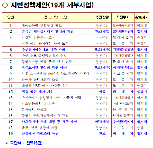 ○ 시민의 목소리에 귀 기울여 반영한 시민정책제안 19건 중 종목별 체육경기 대회 활성화 지원, 주민참여예산제도 대폭 강화, 작은도서관 활성화 방안 마련, 적정 임금 체계 개선, 사회복지사 조례 개정 등 처우 개선, 공유재산 관리조례 복원 등 6건을 추진 완료하였고, 13건을 정상 추진하고 있음.