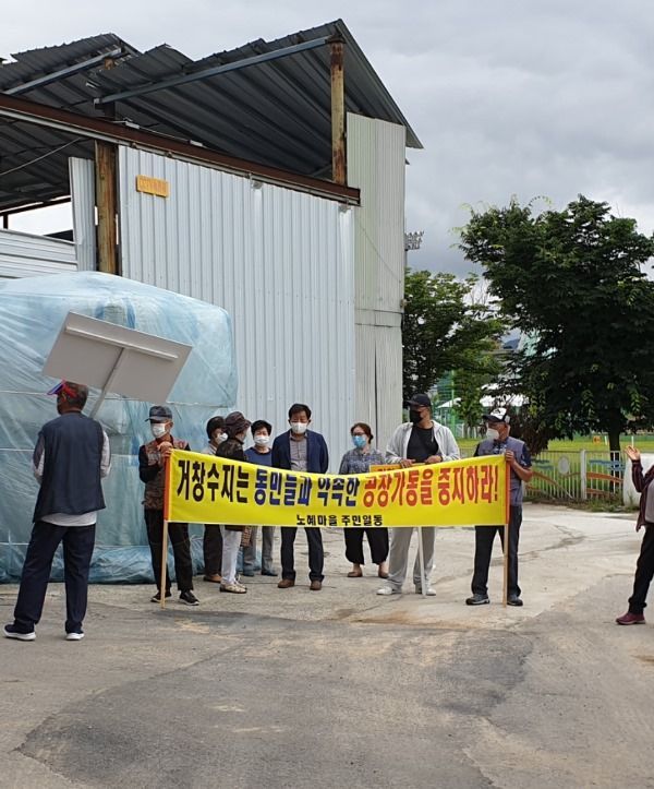 양평리 노혜마을 주민들은 15일 오후 장맛비가 내리는 가운데 "거창 수지" 공장 앞에서 폐기물공장 이전 촉구 집회를 열었다.