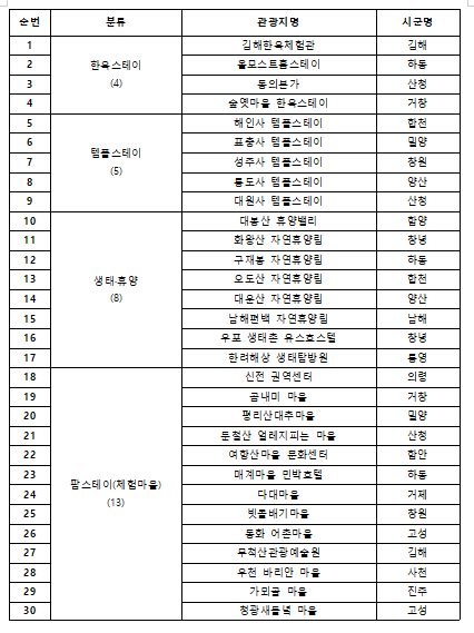 경남 ‘체류형 힐링 숙박여행지 30선’에 대한 보다 자세한 내용은, 경남관광길잡이 홈페이지(http://tour.gyeongnam.go.kr)와 경남도 관광 SNS(페이스북, 인스타그램)에서 확인할 수 있다.