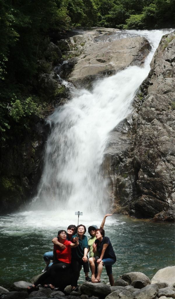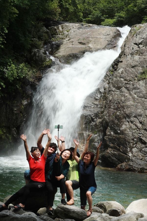 일 경남 함양군 안의면 용추폭포를 찾은 피서객들이 암반 위에서 떨어지는 폭포수를 배경으로 사진을 찍으며 더위를 식히고 있다