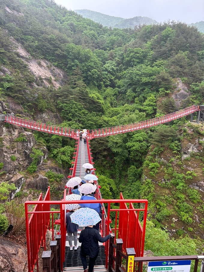 대구국제공항에서 가까운 거리적 이점을 강조하며 첫 번째 코스로 2023-2024 한국관광100선에 선정된 거창 항노화힐링랜드를 방문해 문화관광해설사의 재미있는 문화관광 이야기와 함께 명소 Y자형 출렁다리를 건넜다.