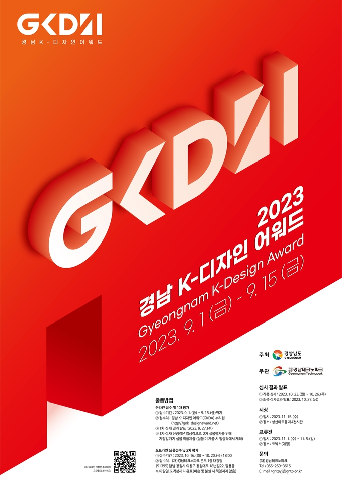 ‘2023 경남 K-디자인 어워드’는 경남도에서 처음으로 개최하는 국제 산업디자인 공모전으로, 9월 1일부터 15일까지 ▴제품/공예 ▴시각/정보 ▴디지털미디어/콘텐츠 ▴공간/환경/서비스 4개 분야에 대해 전 세계 고등학생 이상이면 누구나 출품할 수 있다.