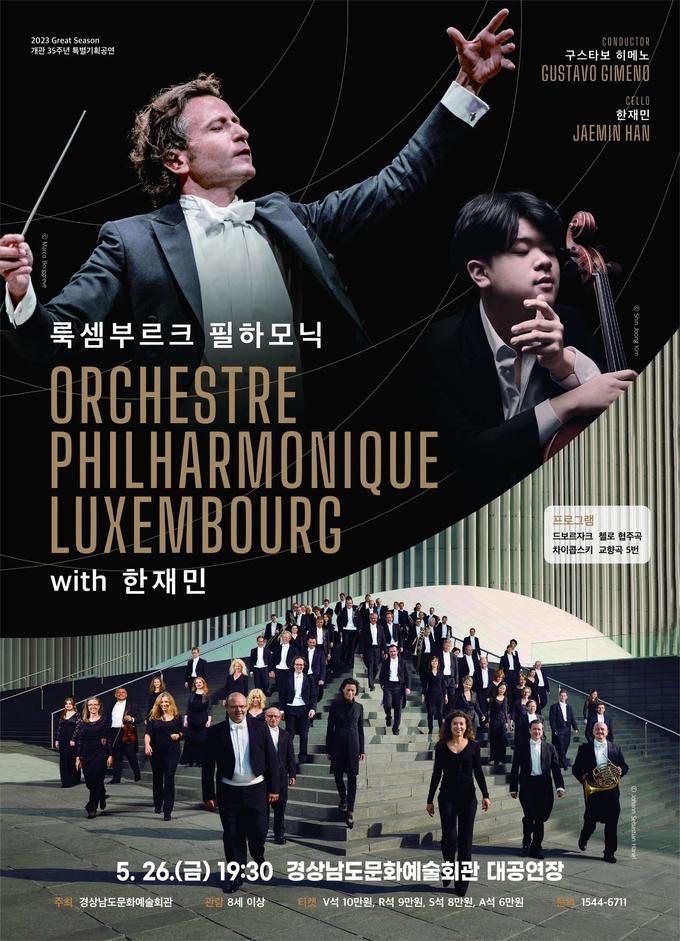 룩셈부르크 필하모닉 with 한재민과 관련된 자세한 내용은 경남문화예술회관 누리집(artcenter.gyeongnam.go.kr)과 전화(☎1544-6711)로 확인할 수 있다. ▲공연일시 5월 26일 19:30 ▲관람연령 8세 이상 ▲티켓 V석 10만원, R석 9만원, S석 8만원, A석 6만원 ▲프로그램 첼로 협주곡(드보르자크), 교향곡 5번(차이콥스키) ▲예매 경상남도문화예술회관 누리집, 1544-6711