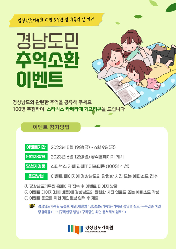 참여방법은 이벤트페이지에 접속하여 경상남도와 관련한 추억(사진 또는 에피소드)을 공유하고 추첨 정보를 입력하면 응모할 수 있으며 추첨을 통해 총 100명에게 모바일 커피쿠폰을 제공한다. 자세한 이벤트참여 방법 및 유의사항은 경상남도기록원 누리집을 통해 확인할 수 있다.