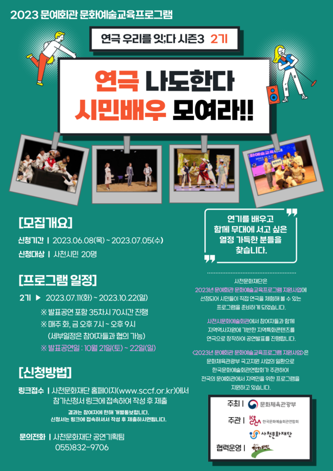 이번 2기 시민배우는 평소 연극에 관심이 있는 지역민은 누구나 신청이 가능하며, 오는 7월 5일까지 사천문화재단 홈페이지 링크를 통해 신청하면 된다.