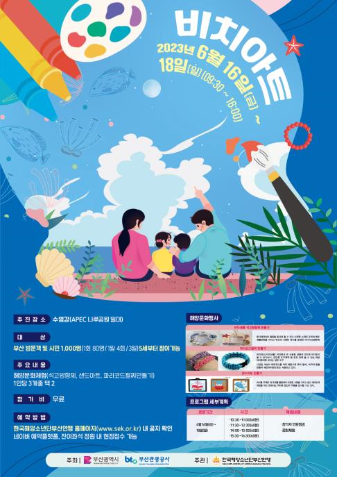‘수영강 비치아트 체험’ 행사는 수영강 나루공원 야외무대에서 오전 10시부터 오후 4시 30분까지 1일 4회, 회당 80명의 체험객을 대상으로 3일간 운영된다. 해양문화체험 3종(▲바다생물 석고방향제 만들기, ▲파라코드 팔찌 만들기, ▲샌드아트) 중 2개를 선택하여 체험할 수 있다.