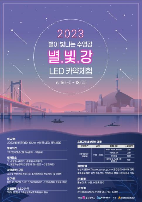 이어 일몰 후 오후 7시 30분부터는 ‘별이 빛나는 수영강 엘이디(LED) 카약 체험’ 행사가 한 시간 동안 진행된다. ‘엘이디(LED) 카약’은 야간관광과 수상레저를 결합한 이색 체험으로, 야간관광 특화 도시인 부산에서 특히 수영강은 도심 마천루의 불빛을 즐길 수 있는 대표적 야경명소로 손꼽힌다.