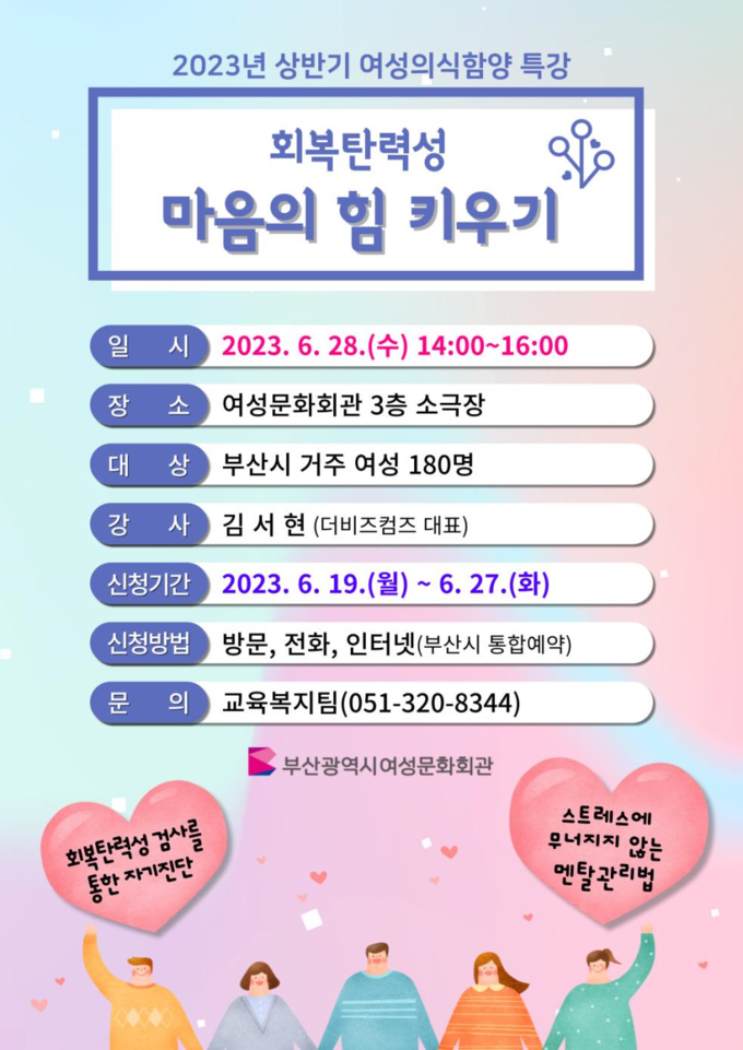 기타 자세한 사항은 여성문화회관 누리집(https://www.busan.go.kr/wcc)을 참조하거나 전화(☎051-320-8344)로 문의하면 된다.
