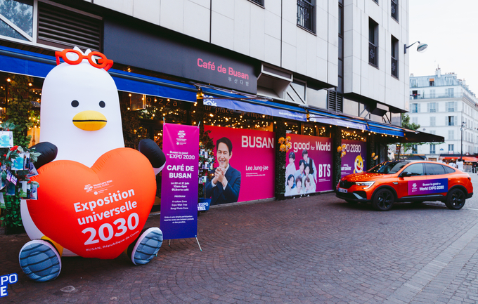 아울러, 부산 다방 카페 입구에 파리 현지 글로벌기업인 르노자동차가 친환경 하이브리드 전기차량(XM3)을 전시하고, 이 차량을 랩핑해 2030부산세계박람회 주·부제를 간접적으로 소개한다. 이는 현지 기업과의 유치 지지 동행을 위한 특별 이벤트로 국제박람회기구 회원국 대상 유치 지지를 확산하기 위해 마련됐다.