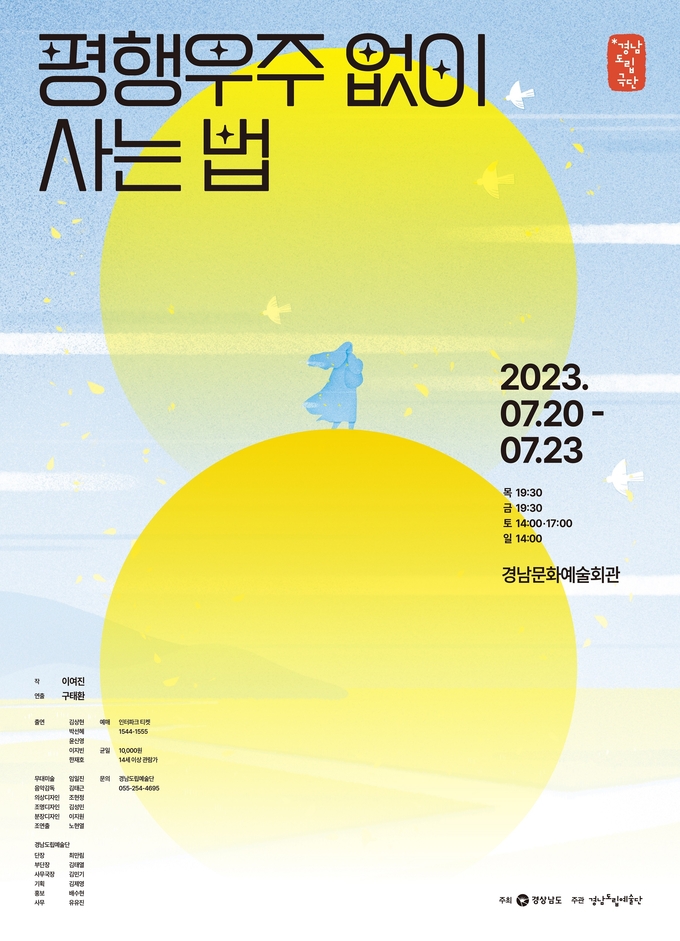 경남도립극단 7월 정기공연 ‘평행우주 없이 사는 법’은 경남문화예술회관 대공연장에서 7월 20일(목) 19시 30분, 21일(금) 19시 30분, 22일(토) 14시·17시, 23일(일) 14시, 4일 5회 공연 예정이며, 자세한 내용은 경남문화예술회관 누리집(https://artcenter.gyeongnam.go.kr) 또는 경남도립예술단 사무국 (055-254-4695)을 통해 확인할 수 있다.