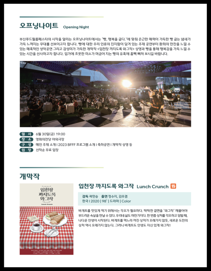 2023 BFFF의 시작을 알리는 ‘오프닝나이트’는 6월 30일 오후 7시 영화의전당 야외극장에서 개막공연을 시작으로 ▲올해의 메인 주제 및 프로그램 소개 ▲‘세레나데의 뮤지컬’ 주제공연 ▲개막작 ‘입천장 까지도록 와그작’ 상영 등의 순으로 진행되며, 선착순 2,000명까지 무료로 입장할 수 있다.
