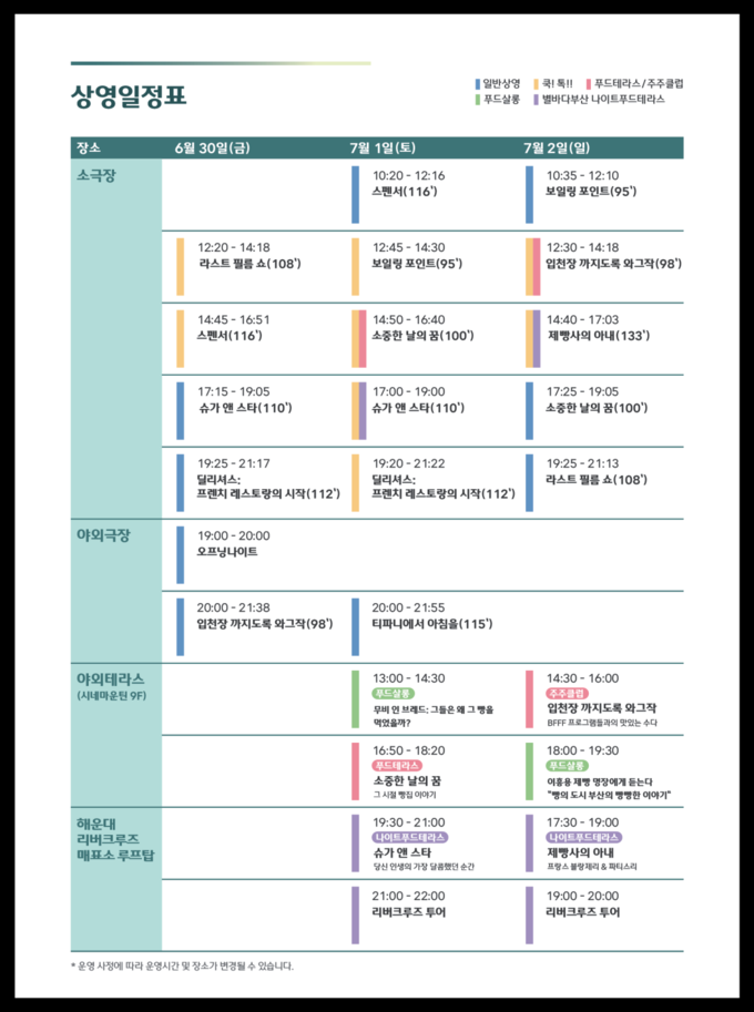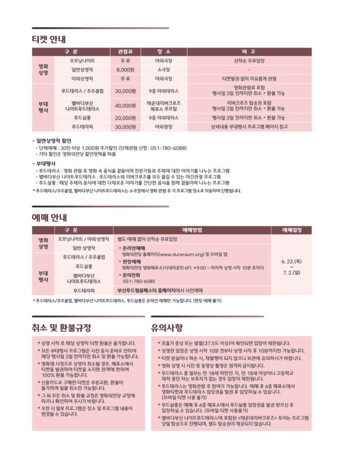 또한, 영화 상영 전 영화 속 음식에 관한 이야기를 사전에 들을 수 있는 BFFF의 프로그래머들과 함께하는 영화 가이드 ‘쿡톡’을 시작으로 영화 속 음식을 직접 맛보고 알아보는 미식클래스 ‘푸드테라스’, 부산푸드필름페스타의 최고 인기 프로그램 ‘나이트크루즈 푸드테라스’가 올해도 부산관광공사와 함께 ‘별바다부산 나이트푸드테라스’로 명칭을 변경해 시민들에게 다가설 예정이다.