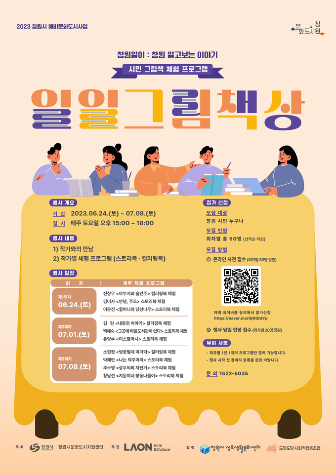 프로그램 참가신청은 (https://naver.me/GjGtDdYp) 또는 포스터 QR코드 접속하여 신청가능하며, 자세한 사항은 창원시문화도시지원센터 ☎265-1213)로 문의하면 된다.