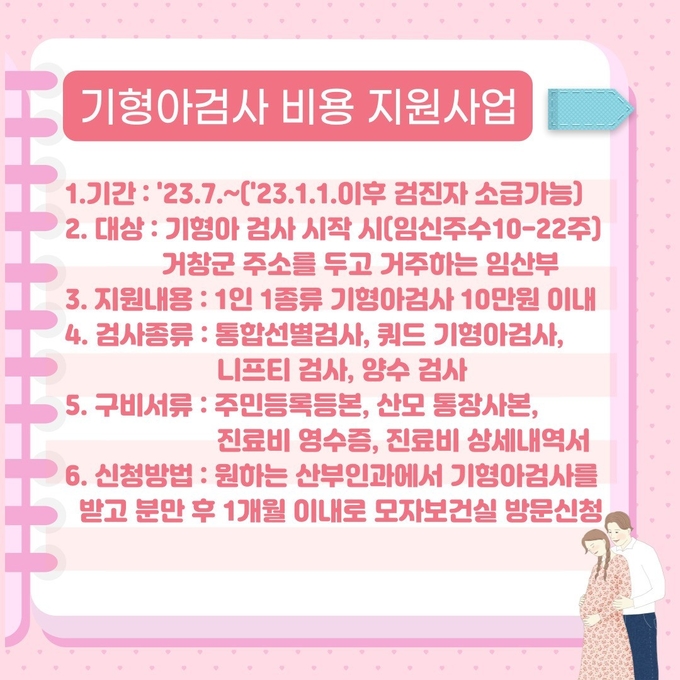 [경남도민뉴스] 거창군은 건강한 자녀 출산과 출산가정의 경제적 부담 경감을 위해 기형아검사 비용 지원사업을 7월부터 운영한다.