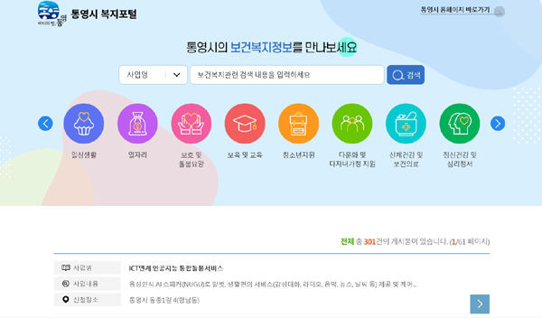통영시복지포털은 통영시를 비롯하여 23개 관내 유관기관에서 실시 중인 일상생활, 돌봄, 보육, 건강 등 11대 영역 총 300여건의 복지정보와 신청방법, 서비스내용 등 상세한 정보를 받을 수 있도록 구성되어 있고, 검색사이트에서‘통영시복지포털’로 검색하거나 통영시홈페이를를 통해 접속이 가능하다.