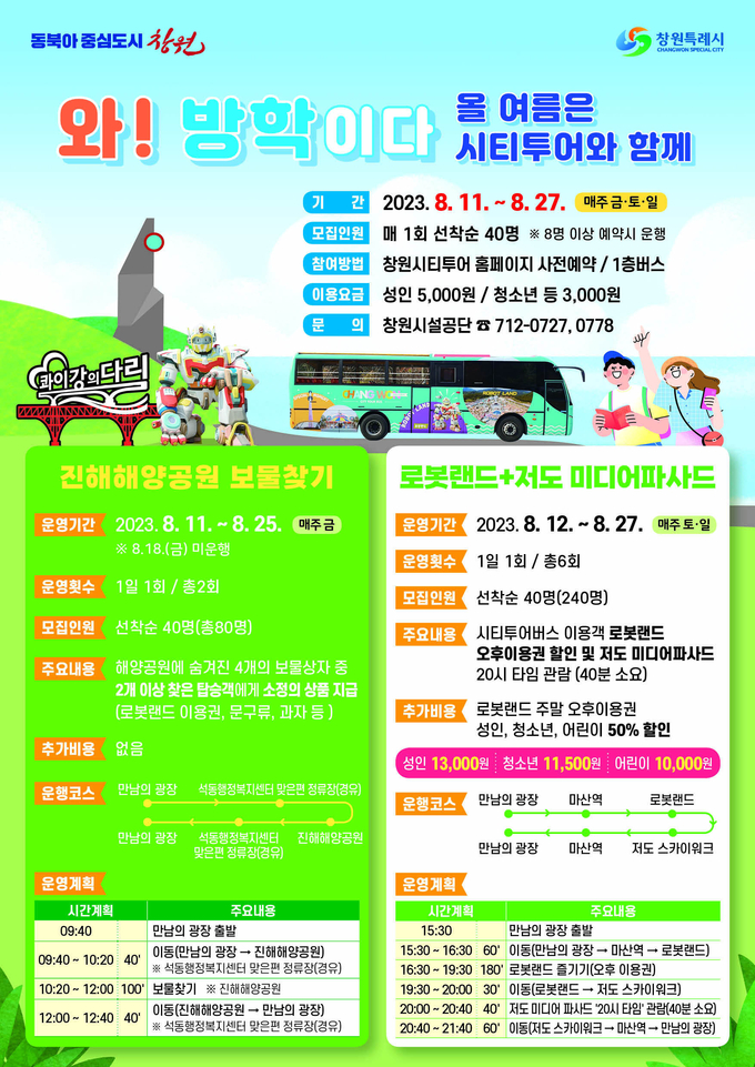 [경남도민뉴스] 창원특례시(시장 홍남표)는 여름방학을 맞아 자녀와 함께 특별한 추억을 쌓을 수 있도록 오는 11일부터 시티투어버스 특별노선을 운행하며, 4일부터 예약을 받는다고 1일 밝혔다.