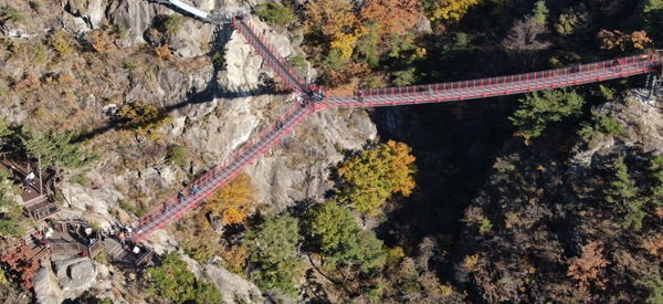 이번에 개통한 거창Y자형 출렁다리는 세 봉우리의 산을 연결하는 전국 최초의 모델로서, 높이 60m에 교각 없는 삼각형 길이 109m의 다리로 거창항노화힐링랜드의 명물로 자리 잡고 있다.