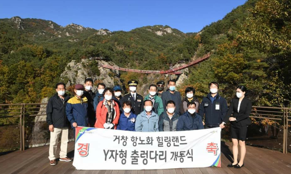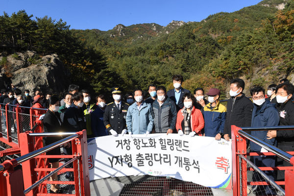 거창항노화힐링랜드 일원에서 진행된 개통식은 식전행사와 함께 시작해 출렁다리 개통에 대한 군민의 기대와 관심 속에 순조롭게 진행됐으며, 이후 Y자형 출렁다리 정상으로 이동해 출렁다리 개통을 알리는 테이프 커팅식을 진행했다.