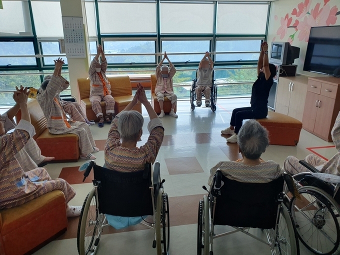 지난 2일에는 병동 3층 휴게실에서 입원환자 중 재활운동이 필요한 11명을 대상으로 보건소 재활사업 담당인력 2명이 노(老)노(NO) 그룹재활스트레칭 교육을 진행했다. 전문 인력의 체계적이고 꼼꼼한 지도 아래 환자들은 동작을 따라하며 즐거운 시간을 보냈고, 무료한 일상 속 병원에 활기가 넘치며 환자들의 만족도가 높았다.