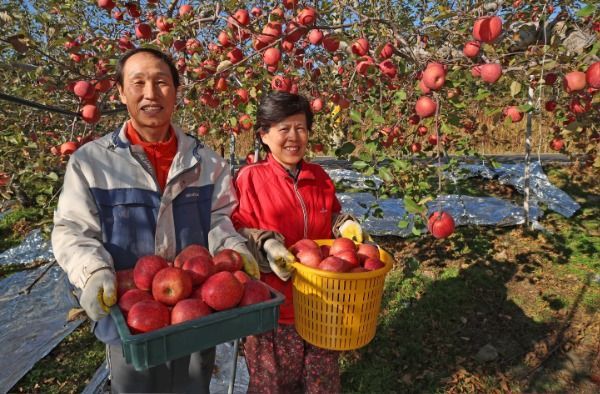 산청군 삼장면의 임병두(60), 이연옥(58) 부부 농가에서 사과 수확이 한창이다.