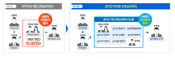 개선 = 비대면 건축심의 시스템 및 허가 신청, 관계 부서 협의, 필증교부까지 온라인으로 진행할 수 있는 언택트 건축허가 및 온라인 열람·발급 시스템 구축