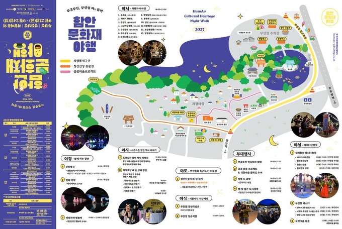 이 외에도 낙화 무드등 만들기, 목간 아트북 만들기 등 함안 문화재를 모티브로 한 체험프로그램인 ‘툭탁툭탁 내 손안의 함안’을 비롯해서, 먹거리와 굿즈를 판매하는 ‘아라가야 마켓’ 과 함안 도시재생센터가 참여해 운영하는 ‘별·달 품은 도시재생’ 부스, 함안의 짬뽕을 맛볼 수 있는 ‘무진場 함안국밥촌’, 깊은 밤 무진정 정자에서 볼 수 있는 선비의 풍류 ‘무진정 버스커’ 공연 등 작년보다 더 풍성한 행사로 구성될 예정이다.