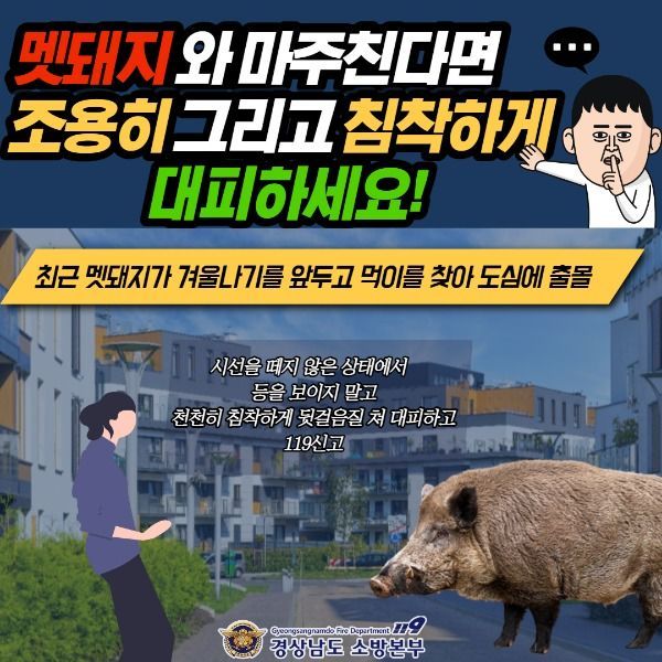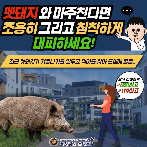 허석곤 경남 소방본부장은 “겨울철 먹이를 찾아 도심에 내려온 멧돼지는 극도로 흥분한 상태이기 때문에 도민의 안전을 위협할 수 있다”며 “마주쳤을 때에는 자극하지 않고, 등을 보이며 달아나지 않는 것이 중요하다”라며 안전행동요령을 당부했다.