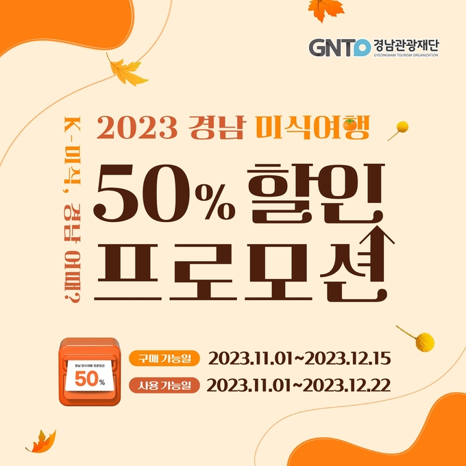 [경남도민뉴스] 경남도와 경남관광재단은 2023년 경남 미식여행 예약결제시스템(이하 시스템)의 할인이벤트를 11월 1일부터 12월 15일까지 45일간 진행한다고 밝혔다.
