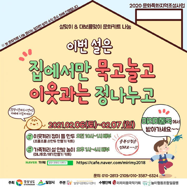 장병수 밀양시 문화도시센터장은 “코로나19로 명절에 친인척들이 모이지도 못하고 문화를 즐기기도 힘들다”면서“힘든 마음과 아쉬움을 문화키트로 달래기를 바란다”고 말했다.