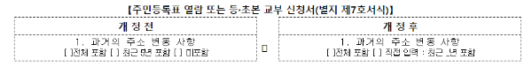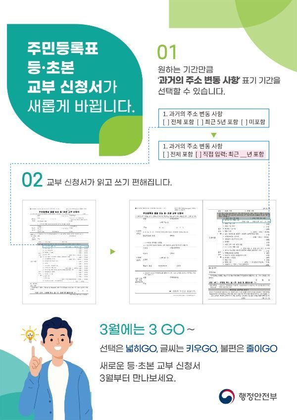이 외에도 ‘큰 글자 서식 도입‘을 위한 제도개선에 따라 고령자 등이 민원 서류를 읽고 쓰기 쉽도록 등·초본 교부 신청서의 글자크기 및 작성란을 확대한다.