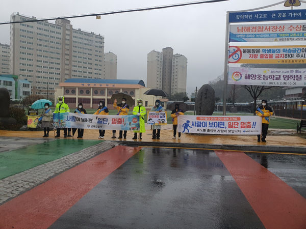 [경남도민뉴스] 남해군(군수 장충남)은 12일 새 학기를 맞아 ‘어린이보호구역(스쿨존) 안전지도 강화’를 위해 남해읍 남해초등학교와 해양초등학교 앞에서 교통안전 합동캠페인을 펼쳤다.