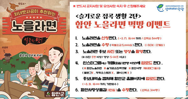 SNS에 노을라면을 홍보한 내역을 3월 20일부터 3월 31일까지 군 홈페이지에 증빙한 선착순 300명에게는 함안사랑상품권 1만원이 지급될 예정이다.