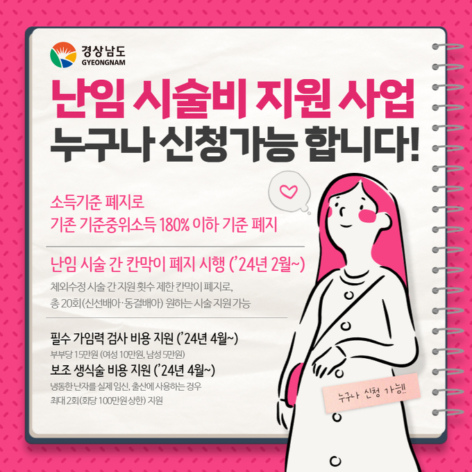 경남도는 그간 난임부부에 대한 시술비를 소득 수준에 상관없이 대상을 확대해 지원하고 있었다. 정부에서도 1월부터 기준중위소득 180% 이하에만 시술비용을 지원하던 사업의 소득 기준을 폐지했고, 2월부터는 난임 시술 간 칸막이를 폐지해 지원의 실효성을 높일 예정이다. 기존 체외수정 시술 중 신선배아 9회, 동결배아 7회, 인공수정 5회를 지원하던 사업을 신선·동결배아 20회(4회 추가), 인공수정 5회로 지원할 예정이다.