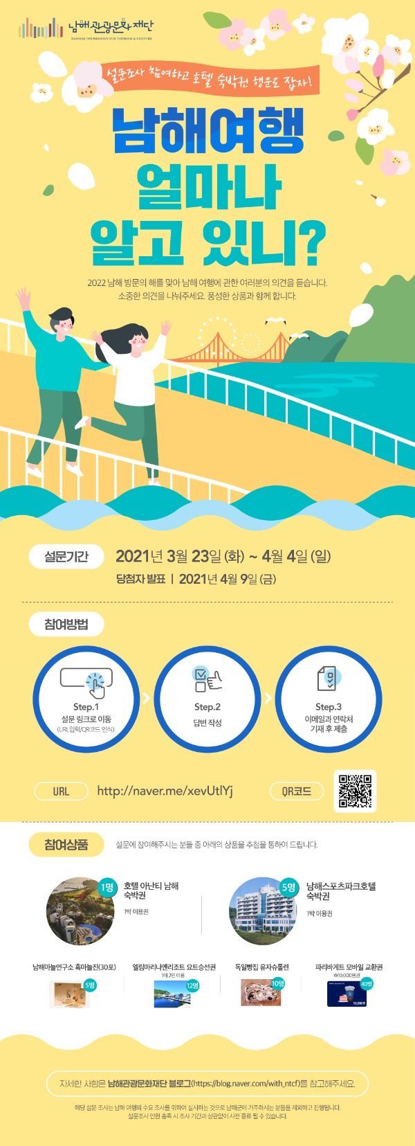 조사 참여는 http://naver.me/xevUtlYj 링크를 직접 클릭하거나 QR 코드를 통해 참여가 가능하며, 문의 사항은 남해관광문화재단 (055)864-4516으로 하면 된다.