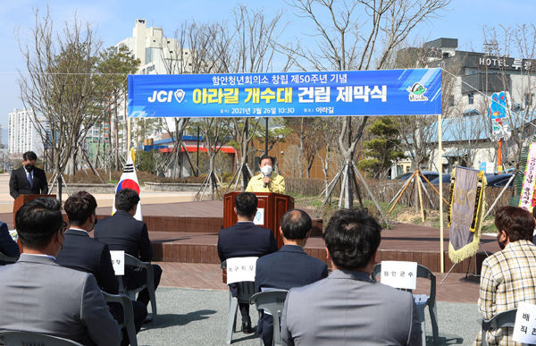 [경남도민뉴스] 조근제 함안군수는 지난 26일 오전, 함안군 작은영화관 입구에서 개최된 아라길 개수대 건립 제막식 행사에 참석하여 건립에 대한 축하의 인사를 전하고 행사 참석자들을 격려했다. 이번에 준공된 아라길 개수대는 함안JC에서 창립 50주년 기념으로 군민의 건강증진과 아라길 활성화를 위해 건립했다.
