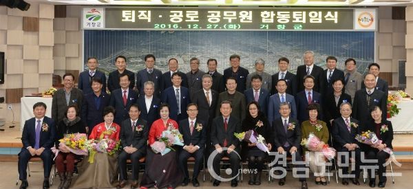 (거창/최병일) = 거창군(군수 양동인)은 27일 오전 11시 군청 대회의실에서 양동인 군수를 비롯해 각종 내빈과 공무원 등 130여 명이 참석한 가운데, 퇴직공직자들의 명예로운 공직생활 마감을 축하하고 가족들의 노고를 격려하는 ‘공무원 퇴임 행사’를 진행했다.