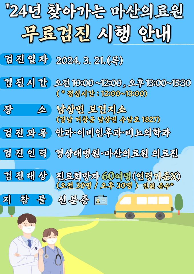 이 사업은 의료접근성을 개선하고 양질의 의료서비스를 제공하기 위해 3개 진료과목(안과, 이비인후과, 비뇨의학과)이 없는 취약지역을 방문해 경상국립대병원·마산의료원 의료진이 13종의 의료장비가 탑재된 버스를 이용, 검진을 해주는 사업이다.