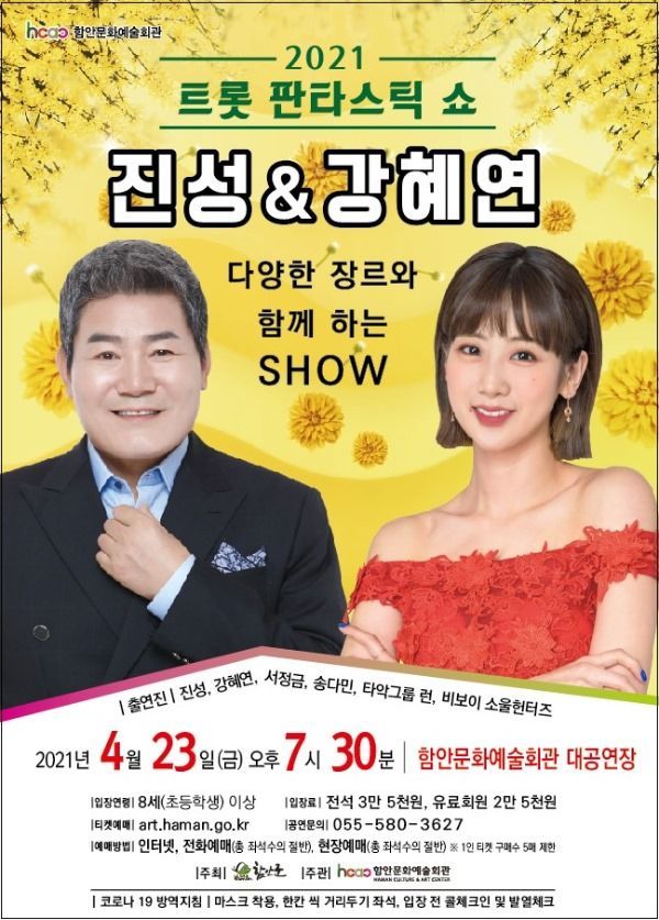 이번 ‘트롯 판타스틱 쇼’ 공연은 ‘안동역에서’, ‘보릿고개’로 대중들에게 많은 사랑을 받고 있는 대세 트로트 아이콘 진성, ‘물레야’, ‘왔구나 왔어’로 사랑을 받은 미스트롯2 미녀 트로트 스타 강혜연, 국립창극단의 입담꾼 국악인 서정금, 전통환술사 송다민, 타악 퍼포먼스팀 런, 비보이 소울헌터즈 팀 등이 화려하게 무대를 채워 관객들의 눈과 귀를 사로잡을 예정이다.
