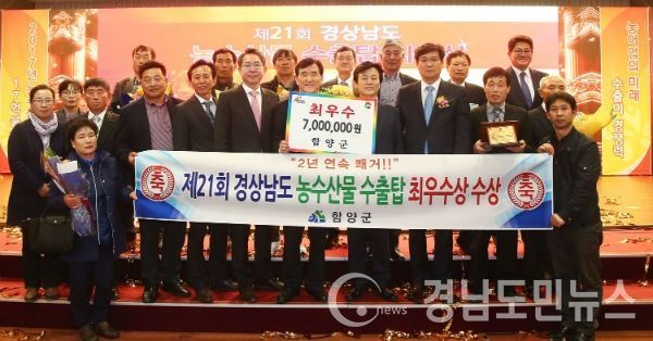 함양군은 17일 오후 2시 진주 LH본사 남강홀에서 250여명의 관계자가 참석한 가운데 열린 제 21회 경상남도 농수산물 수출탑 시상식에서 최우수상을 받았다.