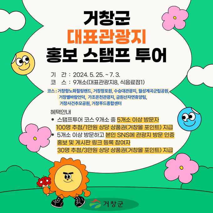 임양희 문화관광과장은 “대표관광지 홍보를 위해 특별히 기획한 스탬프 투어에 많은 군민과 관광객이 참여하여 거창의 동서남북에 위치한 관광지에서 싱그러운 초여름의 기운을 느껴보시기를 바란다”라며, “상품으로 거창의 싱싱한 농특산물을 구입할 수 있는 기회도 얻을 수 있으니 많은 참여를 바란다”라고 말했다.