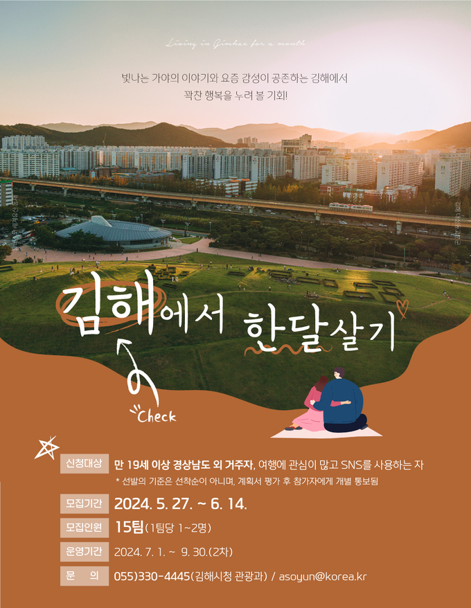 [경남도민뉴스] 김해시가 한 달 살기 프로그램 ‘김해에 반해’ 참가자(2차)를 모집한다.