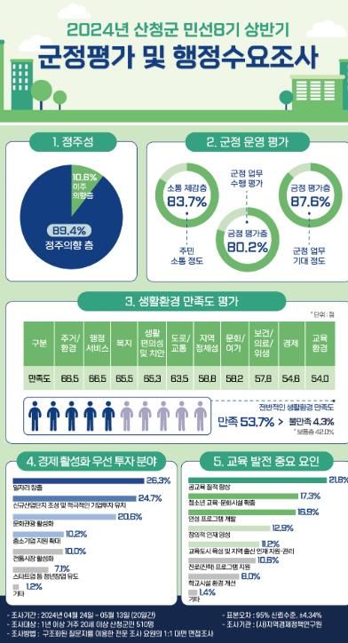 조사는 (사)지역경제정책연구원에 의뢰해 1년 이상 거주 20세 이상 510명의 군민을 대상으로 1대1 대면 면접조사 방식으로 실시했다.
