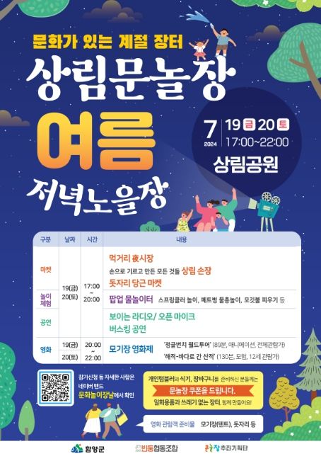 이번 상림 문화놀이장날은 ‘먹거리 夜시장’, 손으로 기르고 만든 모든 것들 상림 손장, 돗자리 당근마켓과 팝업물놀이터, 페트병 물총놀이, 모깃불 피우기와 보이는 라디오/오픈마이크 버스킹공연이 마련되어 있다