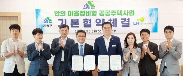 [경남도민뉴스] 함양군은 3일 오후 군수실에서 진병영 군수, 최재열 한국토지주택공사(LH) 경남지역본부장이 참석한 가운데 안의 마을정비형 공공주택사업 기본협약을 체결했다.