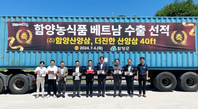 [경남도민뉴스] 함양군은 4일 안의면에 위치한 ㈜함양산양삼(대표 이종상)에서 조여문 함양군 부군수를 비롯한 수출관계자 15명이 참석한 가운데 산양삼가공품을 베트남에 수출하는 선적식을 가졌다.